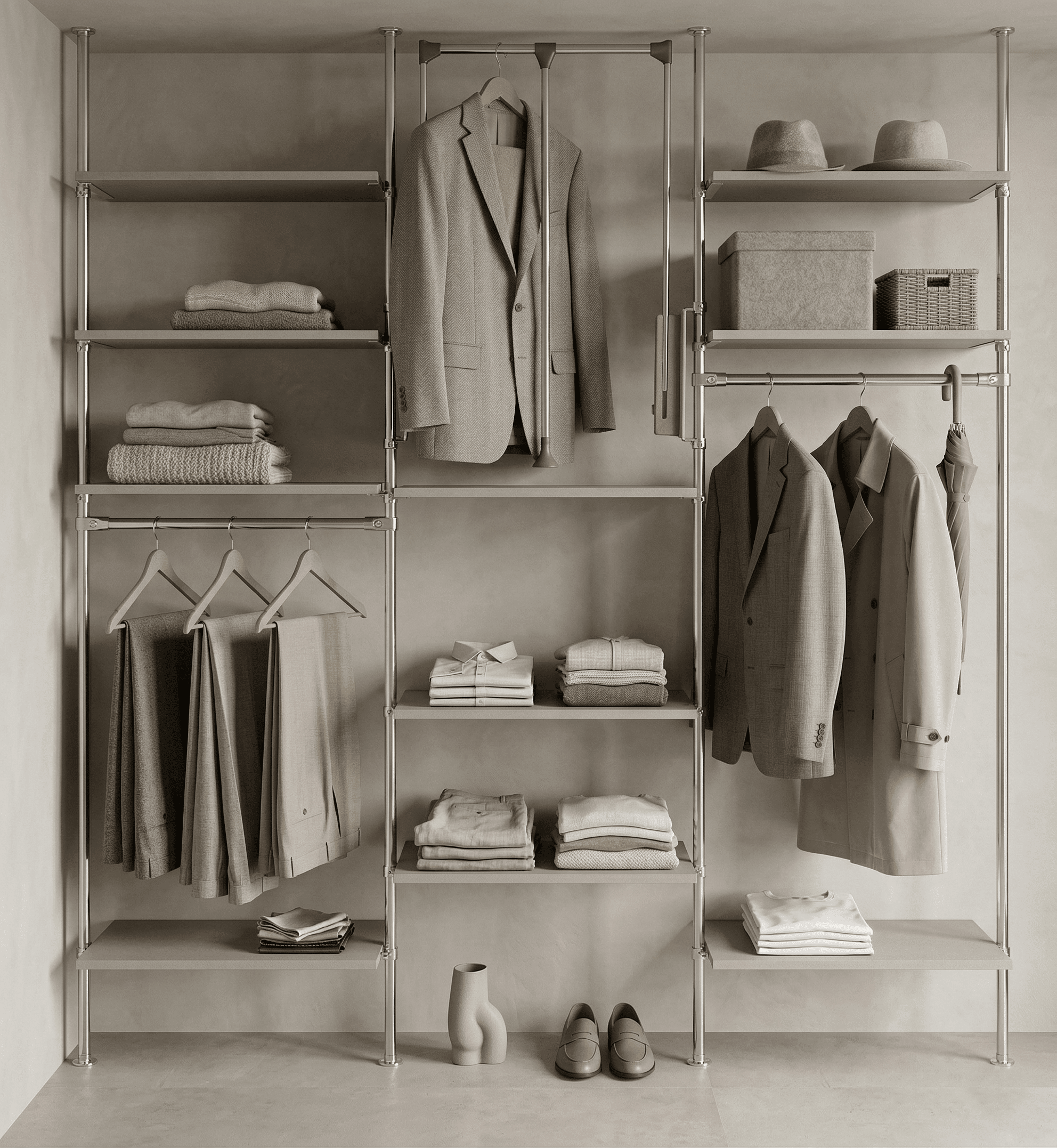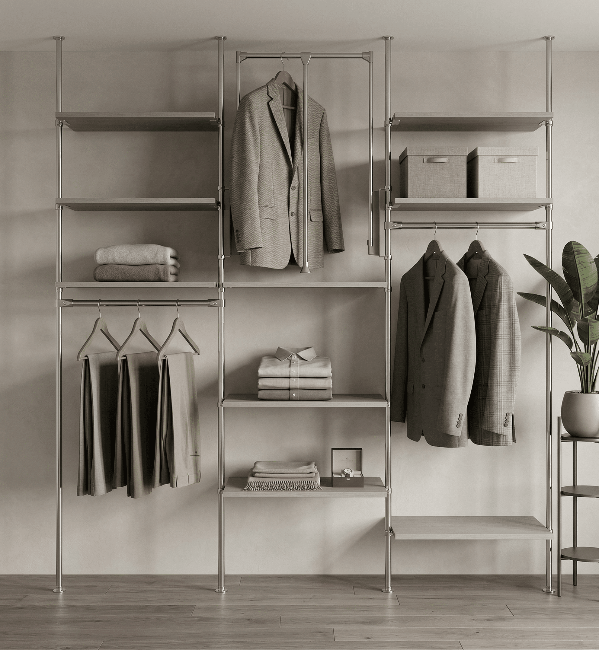 Das C S A M A Y . Chrom Regalsystem ist ein kostengünstiges und sehr flexibles Innensystem. Es zeichnet sich durch seine Einfachheit in der Planung und Montage aus. Die Regale sind vollkommen individuell planbar und stufenlos höhenverstellbar. Man kann Fachöden, Schubladenkorpusse, Kleiderlifte oder Hosenauszüge einplanen.